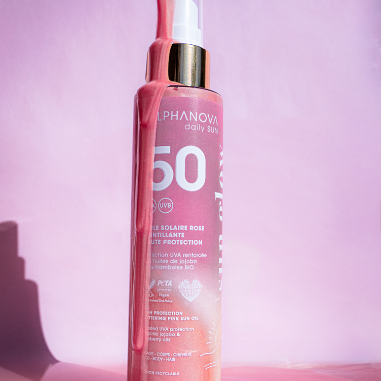 Ontdek de Alphanova Daily Sun - Glittering Pink Sun Oil SPF50, een unieke zonbeschermingsolie die jouw huid niet alleen beschermt, maar ook laat stralen. Deze olie biedt een hoge bescherming tegen schadelijke UV-stralen dankzij het innovatieve UVA BOOST-complex. Met een formule verrijkt met natuurlijke roze parelmoer, zorgt deze zonolie voor een subtiele glans op de huid. Ideaal voor wie op zoek is naar een combinatie van bescherming en een stralende teint.